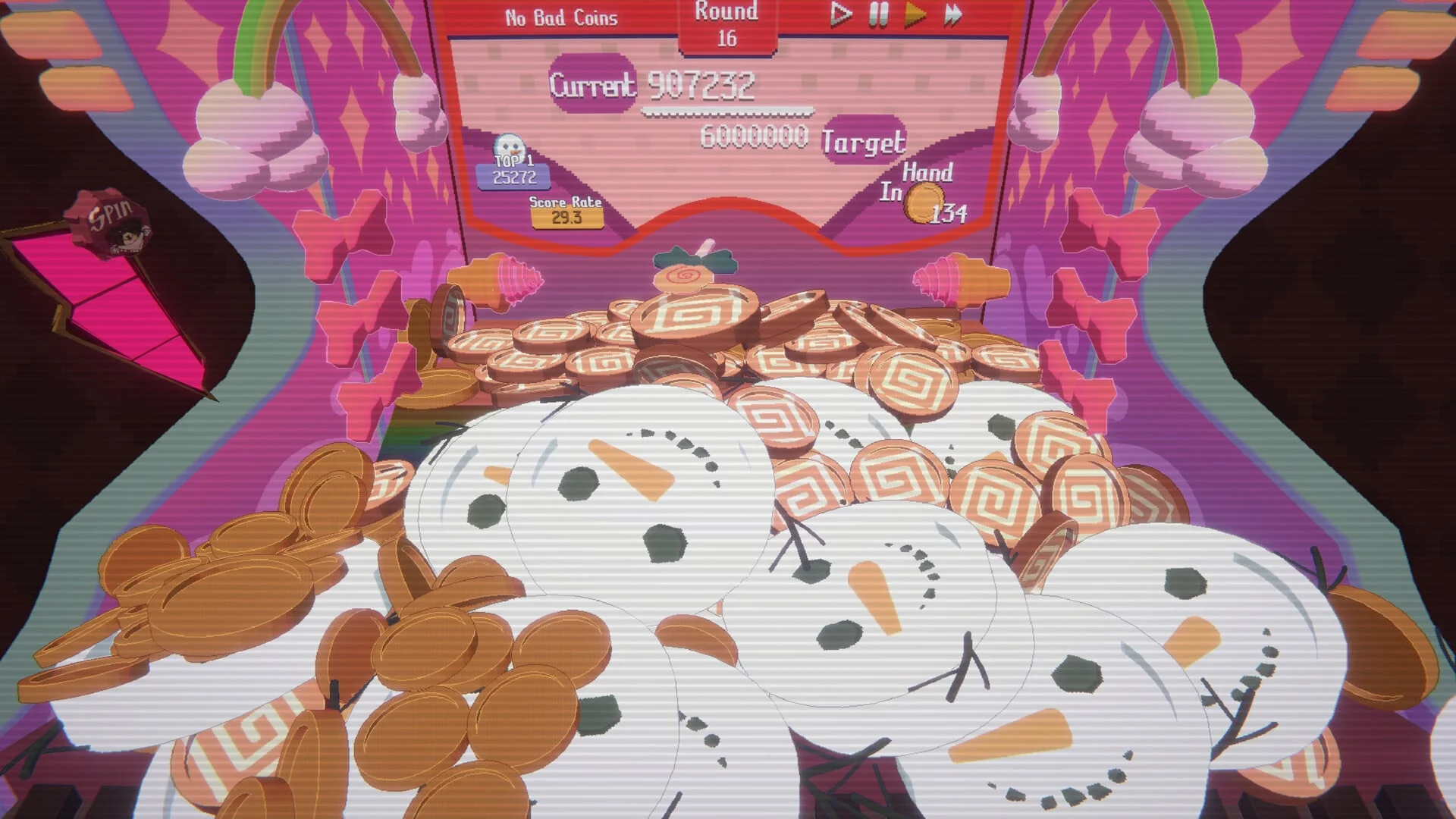 If you’re familiar with coin pushers, this is a lot like it. You keep an eye on where high value coins or items you want in the pusher are, then deploy the 20-at-a-time in your pocket to push them down to meet increasing goals in each round. So much of it is left to chance and physics. Yes, if you time it out and get accustomed to the triggers, you can send out coins at the right time to get positioning in such a way that you hit certain spots. There are absolutely ways to exploit the multiplier function to ensure spins so you can get more Prizes in balls dropped on the lower tier of the machine. But at the same time, the nature of it means you can just… have a bad run. Especially if you get Bad Coins on the field and the necessary special coins aren’t appearing in the shop for you to zap them out of existence and remove their penalties in the process.